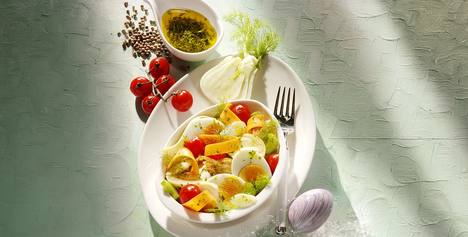 Das Gemüse putzen und waschen. Fenchelknollen achteln. Möhre mit einem Sparschäler in dünne Streifen, Frühlingszwiebeln in dünne Ringe, Staudensellerie in Scheibchen, die Ostereier schälen und in Scheiben schneiden. 2 EL Öl erhitzen und den Fenchel darin leicht anbraten, pfeffern und mit Balsamico Essig löschen. Den Fenchel mit dem restlichen Gemüse, den Tomaten und den Eiern auf Tellern anrichten. Die Kräuter abbrausen, gut abtropfen lassen und fein hacken. Für die Sauce Essig mit Salz, Pfeffer, Honig und den Kräutern verrühren, das Öl darunter schlagen und die Sauce über den Salat geben.