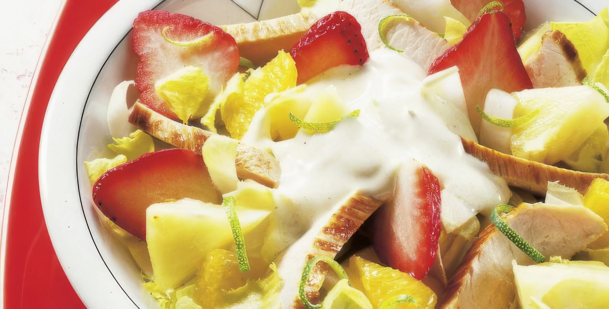 Putenfleisch in 2 EL heißem Rapsöl rundherum schön knusprig anbraten, abkühlen lassen und in Streifen schneiden. Mit einer Marinade aus 1 EL Rapsöl, Obstessig und Sojasauce beträufeln. Erdbeeren waschen, putzen und halbieren. Ananas und Orangen schälen. Ananas in Scheiben, dann in Stücke schneiden, Orangen filetieren und quer schneiden. Chicorée und Staudensellerie putzen und waschen. Den Chicorée quer in Streifen, Staudensellerie in Scheibchen schneiden. Das Obst und das Gemüse unter das marinierte Fleisch heben. Den Joghurt mit Pfeffer, Meersalz und Curry würzen und über den Salat verteilen. Dazu Rote-Bete-Saft trinken.