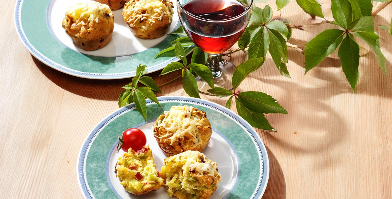 Das Öl mit den Eiern und der Milch verquirlen. Mit Salz und Pfeffer kräftig würzen. Das Mehl sieben, Backpulver unterheben, an die Eimasse geben und zu einem glatten Rührteig verrühren. Die Frühlingszwiebeln in Ringe schneiden. Die Zwiebel schälen und in feine Würfel schneiden. Räucherspeck, Paprika und Champignons in kleine Stücke schneiden, mit den Zwiebeln in 3 EL Öl andünsten und mit den Kräutern unter den Rührteig heben. Den Emmentaler reiben. Die Masse in zwölf Muffinförmchen füllen, mit Käse bestreuen und bei 180-190 °C 20-25 Minuten backen.