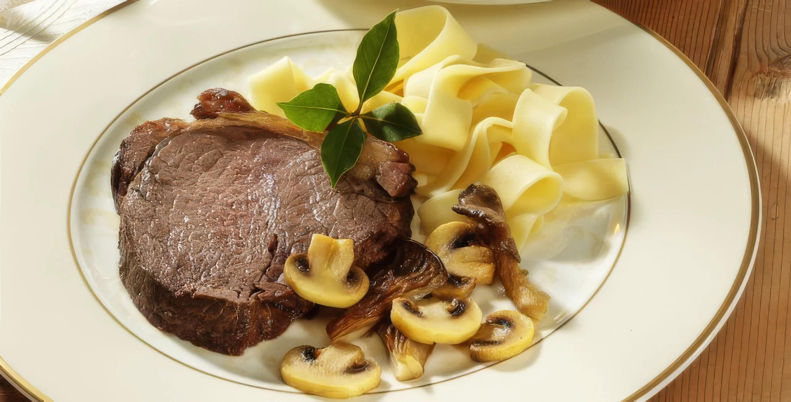 Das Fleisch mit kaltem Wasser abbrausen und trocken tupfen. Kräftig mit Salz, Pfeffer und Thymian einreiben. Das Gemüse putzen, waschen und grob zerkleinern. Die Butter in einem Bräter erhitzen, das Fleisch hinein legen und von allen Seiten scharf anbraten. Gemüse zugeben und etwas andünsten lassen. Mit Fleischbrühe angießen, Nelken, Pfefferkörner und Lorbeerblätter zugeben und alles zugedeckt etwa 2 Stunden bei 200 °C im vorgeheizten Backofen schmoren lassen, dabei mehrmals wenden. Die Nudeln nach Packungsaufschrift zubereiten. Die Pilze putzen, waschen, gut abtropfen lassen und in mundgerechte Stücke schneiden. Zwiebel und Knoblauchzehe abziehen und fein würfeln. Die Pilze in heißer Butter kurz andünsten, Zwiebel und Knoblauch zugeben und einige Minuten weiter braten. Mit Pfeffer und Salz würzen und warm stellen. Den Rinderbraten aus dem Bräter nehmen und warm stellen. Den Bratfond durch ein Haarsieb in eine Kasserolle gießen, den Wein und den cremig gerührten Schmant zugeben und die Sauce etwas einkochen lassen, dabei etwas Saucenbinder zugeben. Mit Pfeffer und Salz abschmecken. Den Braten in Scheiben schneiden und mit Pilzen, Nudeln und Sauce servieren.