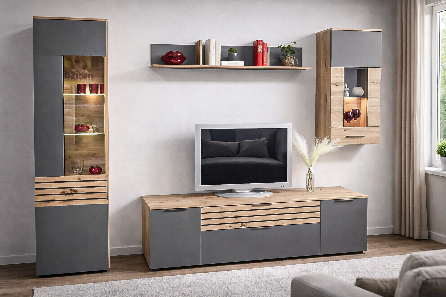 Bestehend aus: Vitrine, TV-Teil, Hängeteil und Wandboard.