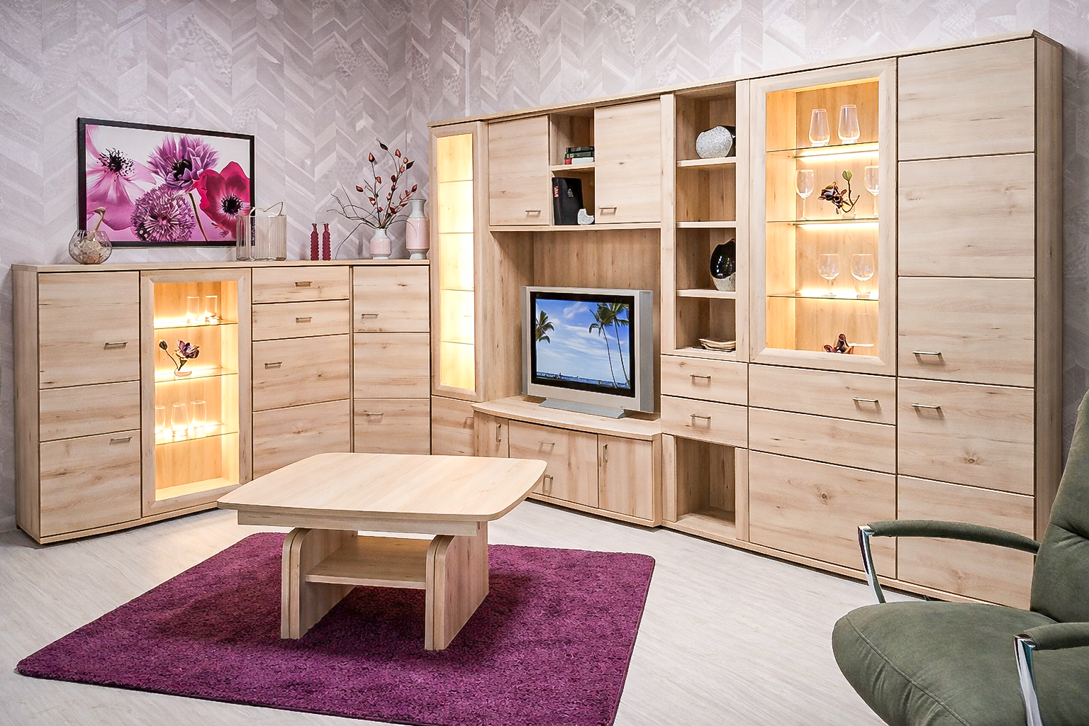 Eckkombi – Anbauwand in Dekor Naturbuche, Türdämpfer, Selbsteinzug und Softstop an Schubkästen, gerundete Abschlussteile inkl. Licht und Glasböden, Maß: ca. 2,40 m x 3,90 m