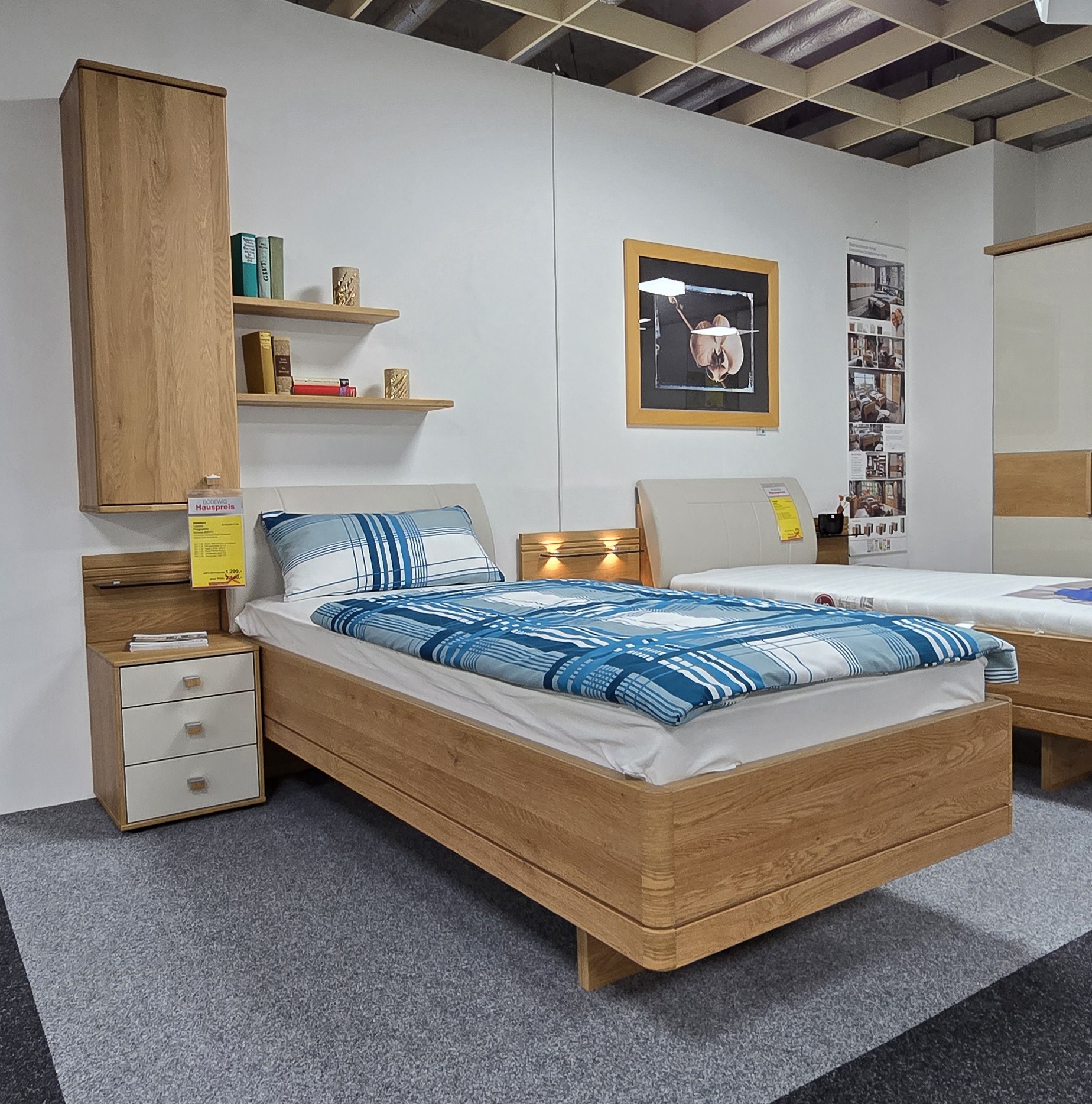 Komfortbett schwebend 90 x 200 cm in Eiche teilmassiv, Kopfteil Stoff in Lederoptik beige.