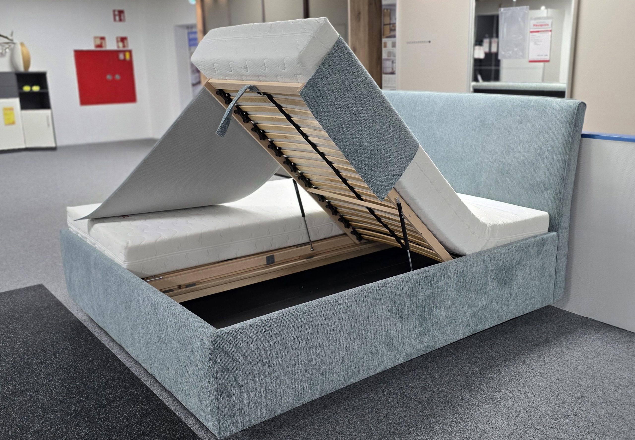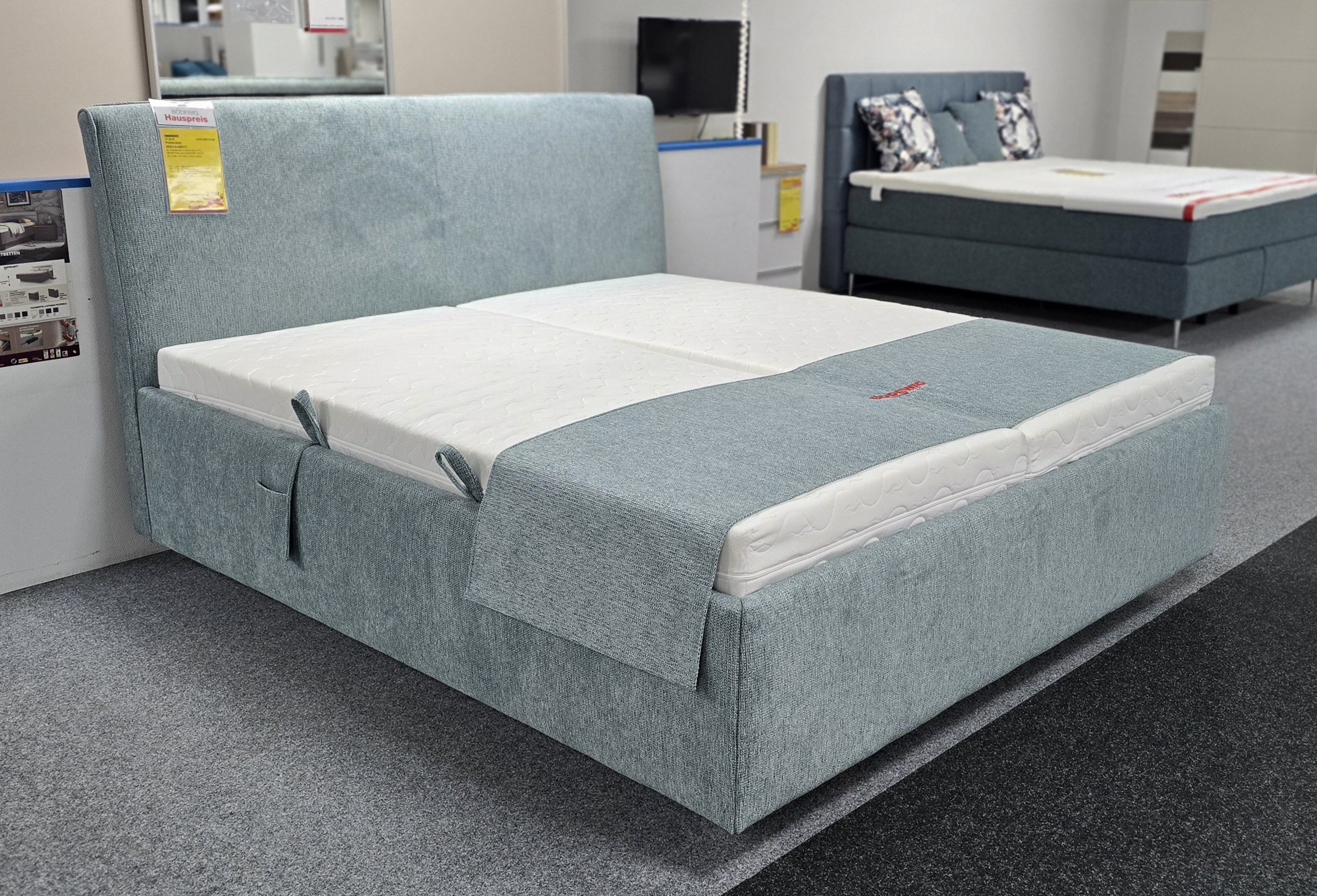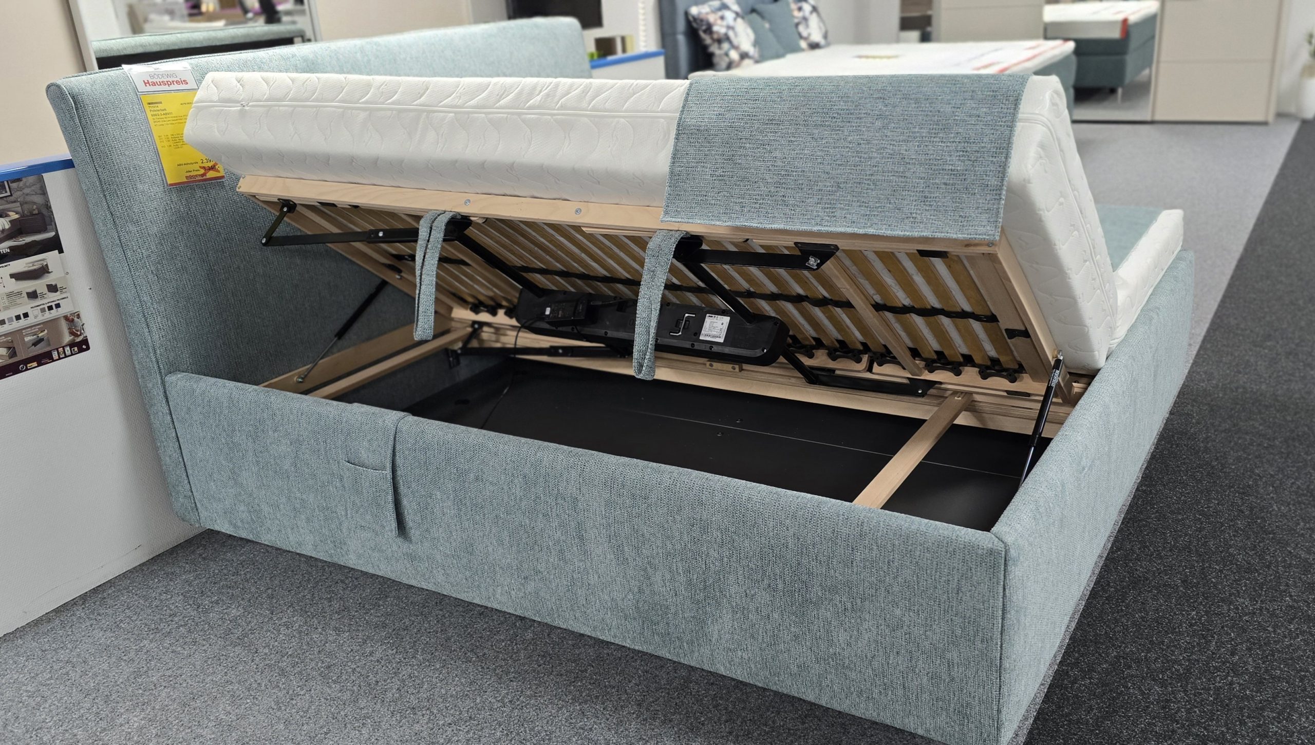 Beidseitig aufklappbar mit Bettkasten. Rechts von vorn, linke Seite seitlich mit Motorlattenrost inkl. Fernbedienung.
