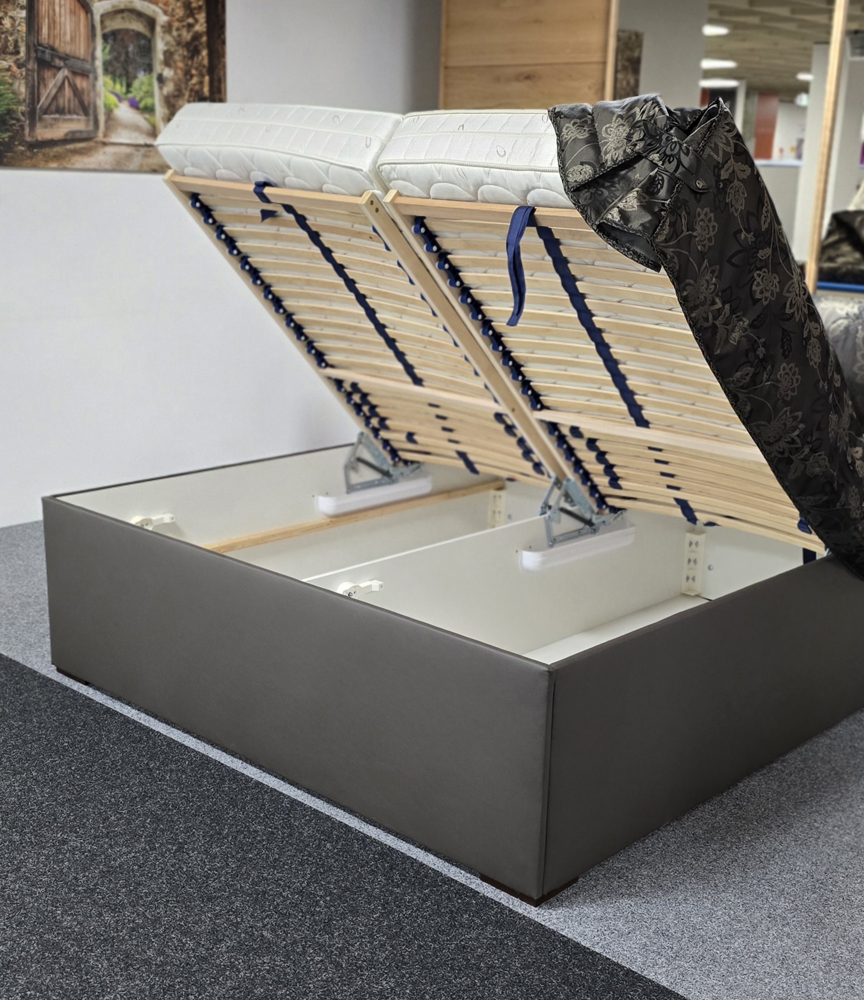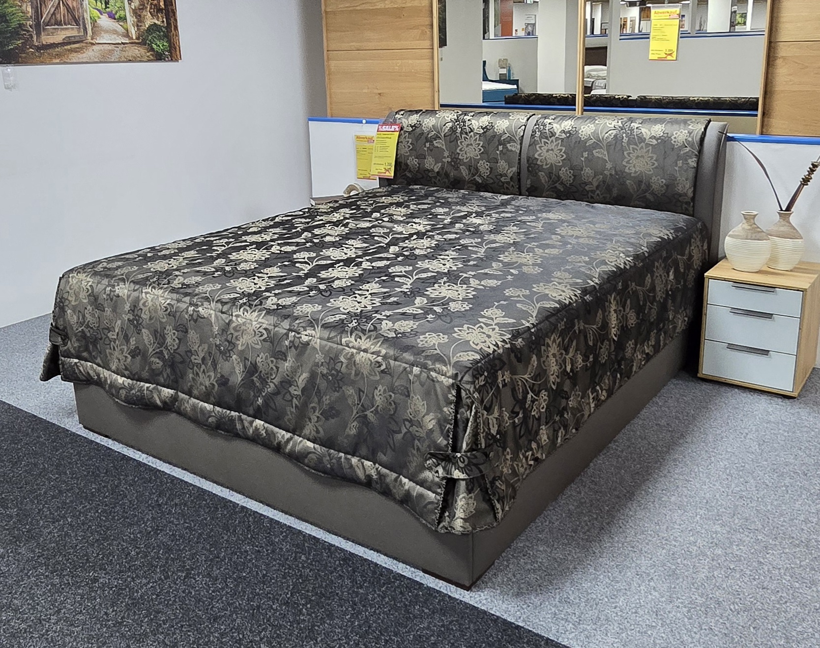 Polsterbett im Stoff anthrazit gold geblümt, in 180 x 200 cm mit Bettkasten, Bonellfederkern-Matratzen H3, Doppelflexrahmen und Tagesdecke.