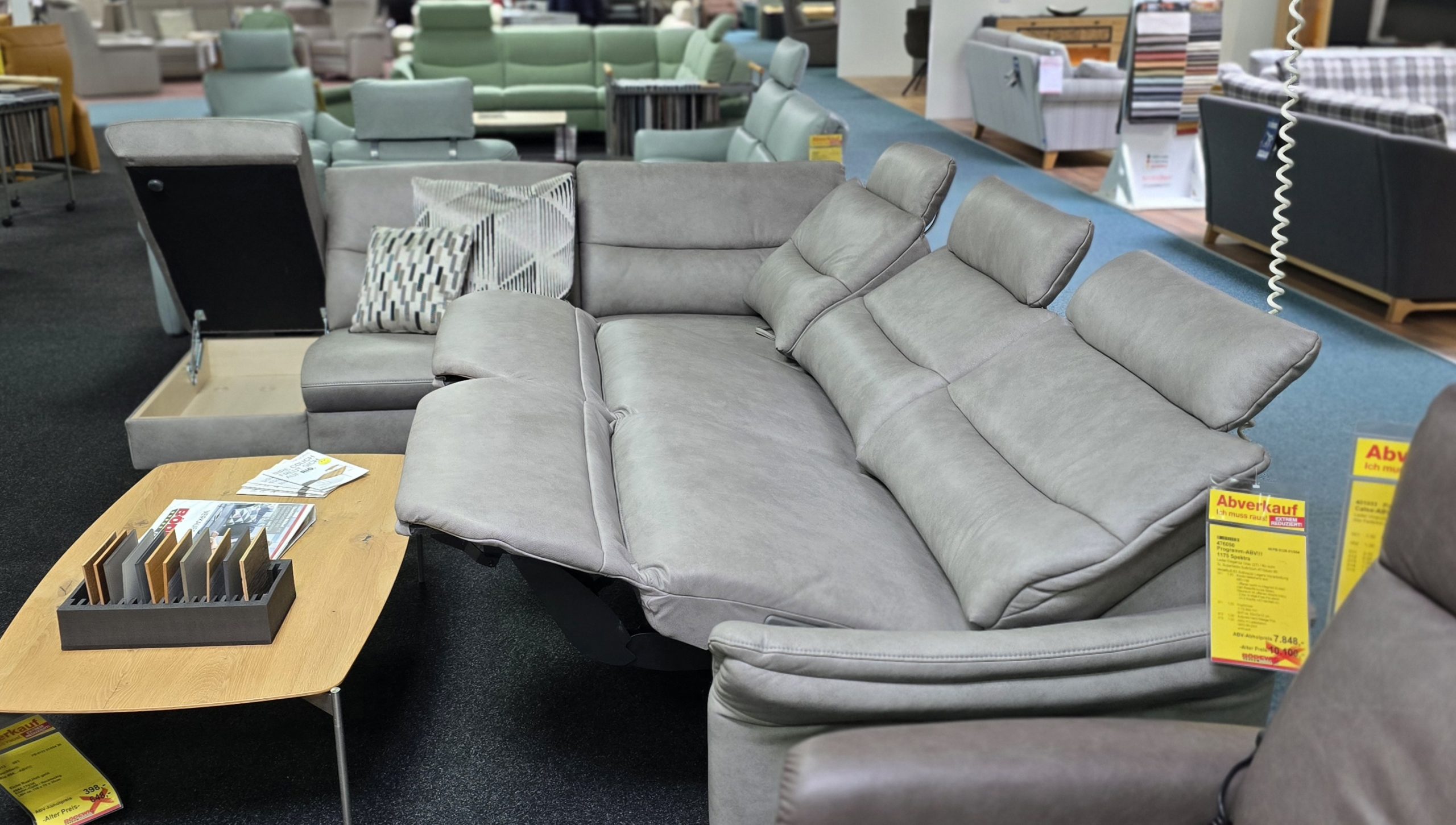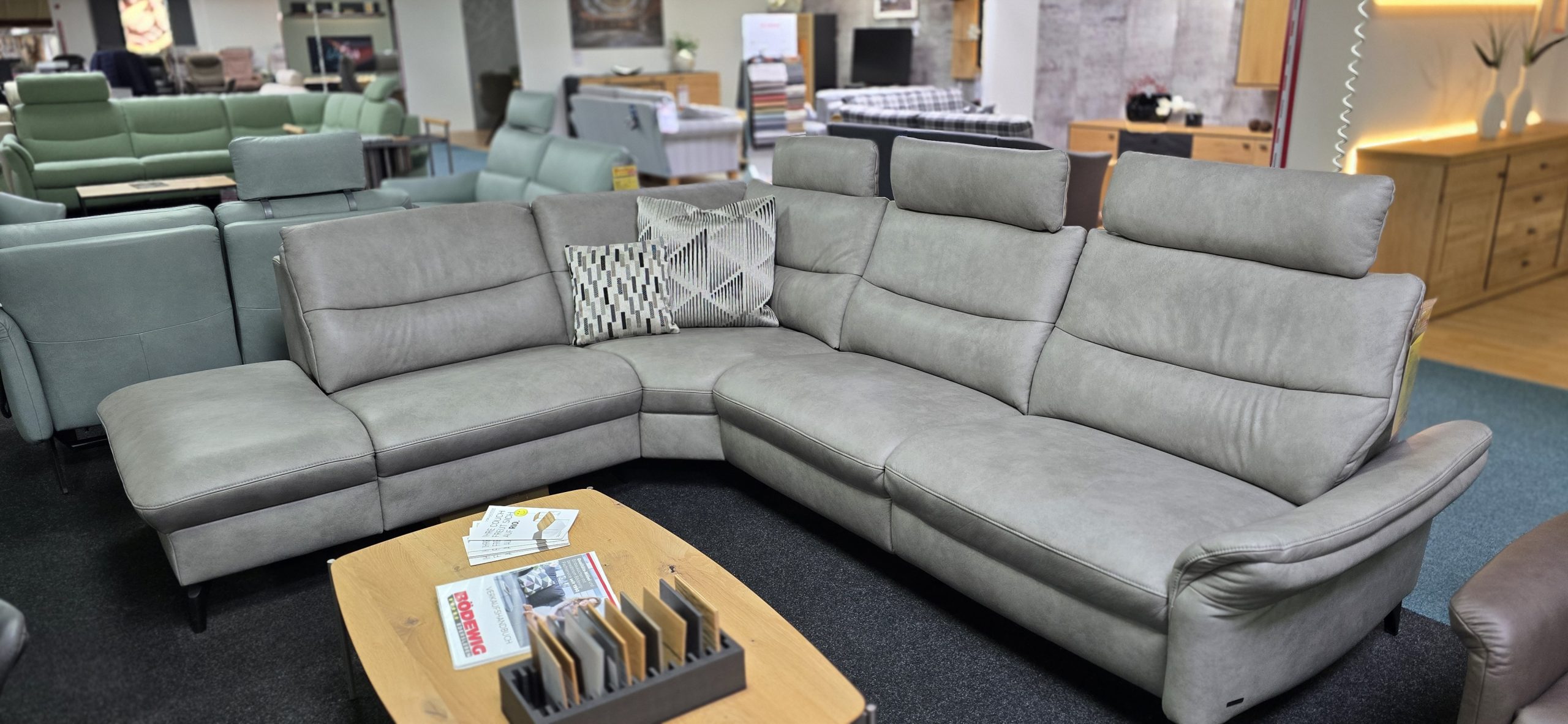 Kombi inklusive Stauraum, 3 Kopfstützen, 2 Kissen, manuelle Relaxfunktion im kurzen Teil, 2 x elektrische Wall-Free-Funktion zur Herz-Waage-Postion, Armteilverstellung und Akku mit Ladestation.