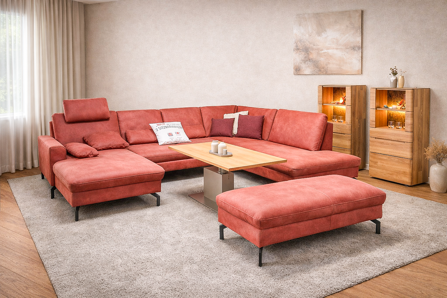– Kombi: Canape mit motorischer Verstellung + Kopfstütze, Armlehne links, 2,5 Sitzer mit Querschläfer, Spitzecke, 1,5 Sitzer mit Anstellhocker + Kopfstütze