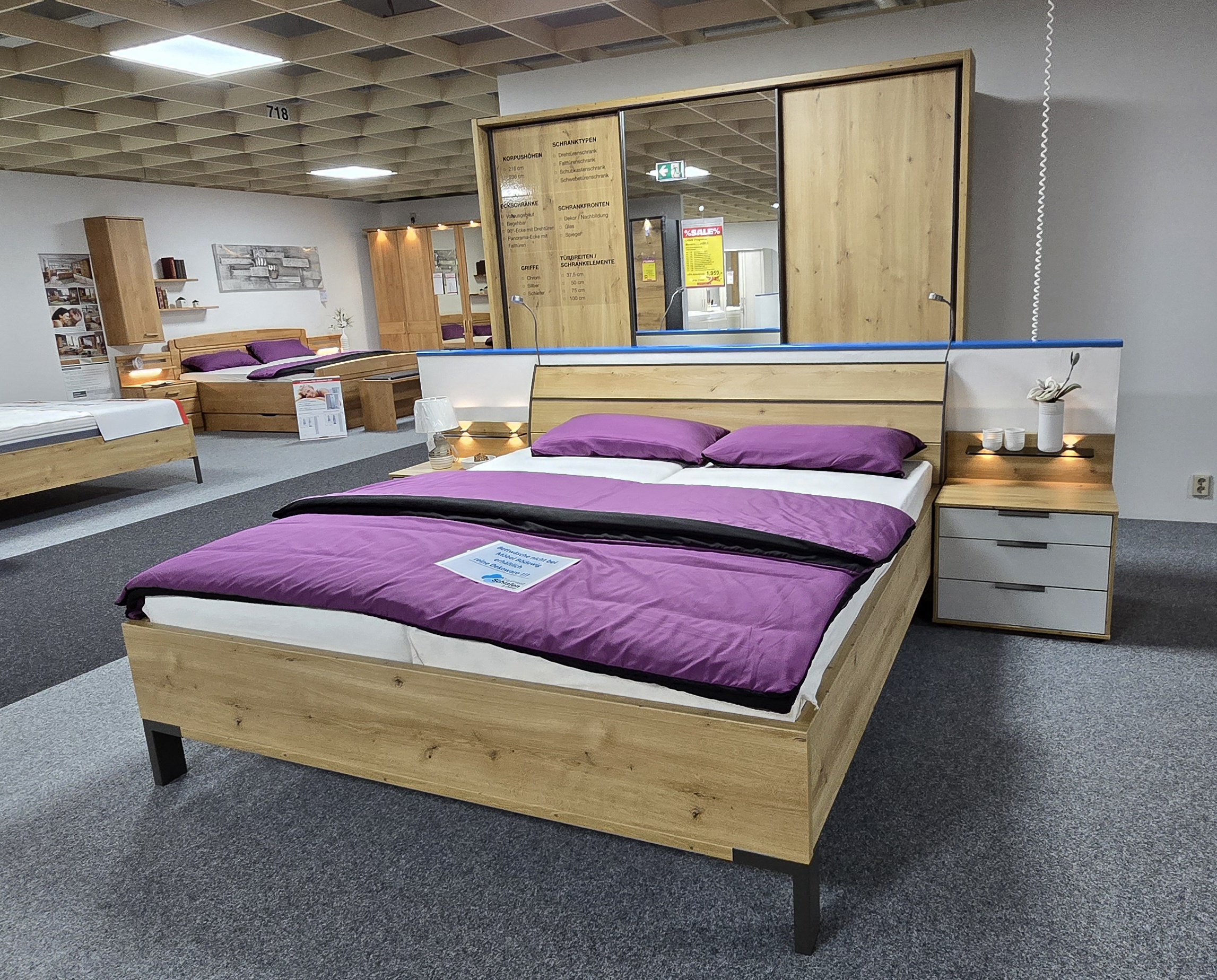 Paneel mit LED-Beleuchtung sowie LED-Flexleuchten fürs Bett. Bett 180 x 200 cm, Höhe 48 cm.