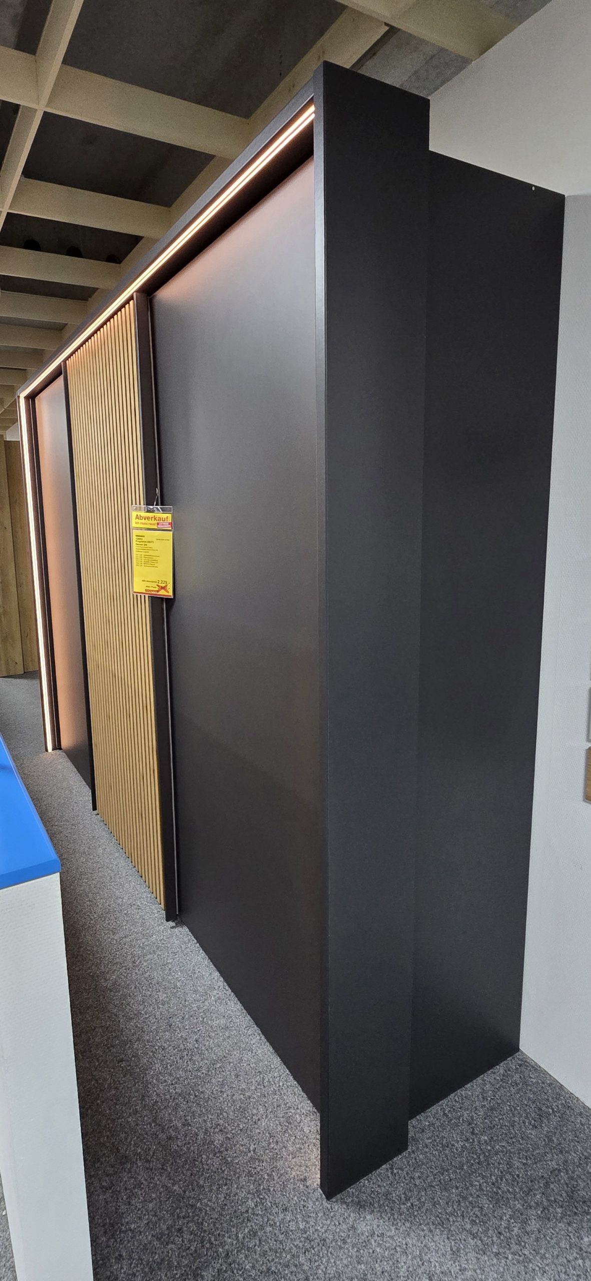 Schwebetürenschrank 3-türig, Front und Korpus Graphit-Dekor Senkrechtleisten mittige Tür in Bianco-Eiche Nachbildung.