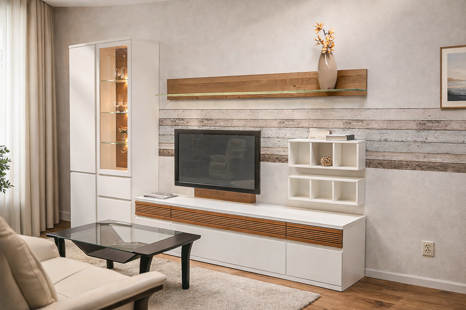 in Lack Weiß, Absatzfarbe Balkeneiche Bronze, inklusive Beleuchtungen, TV-Halter und Repeater