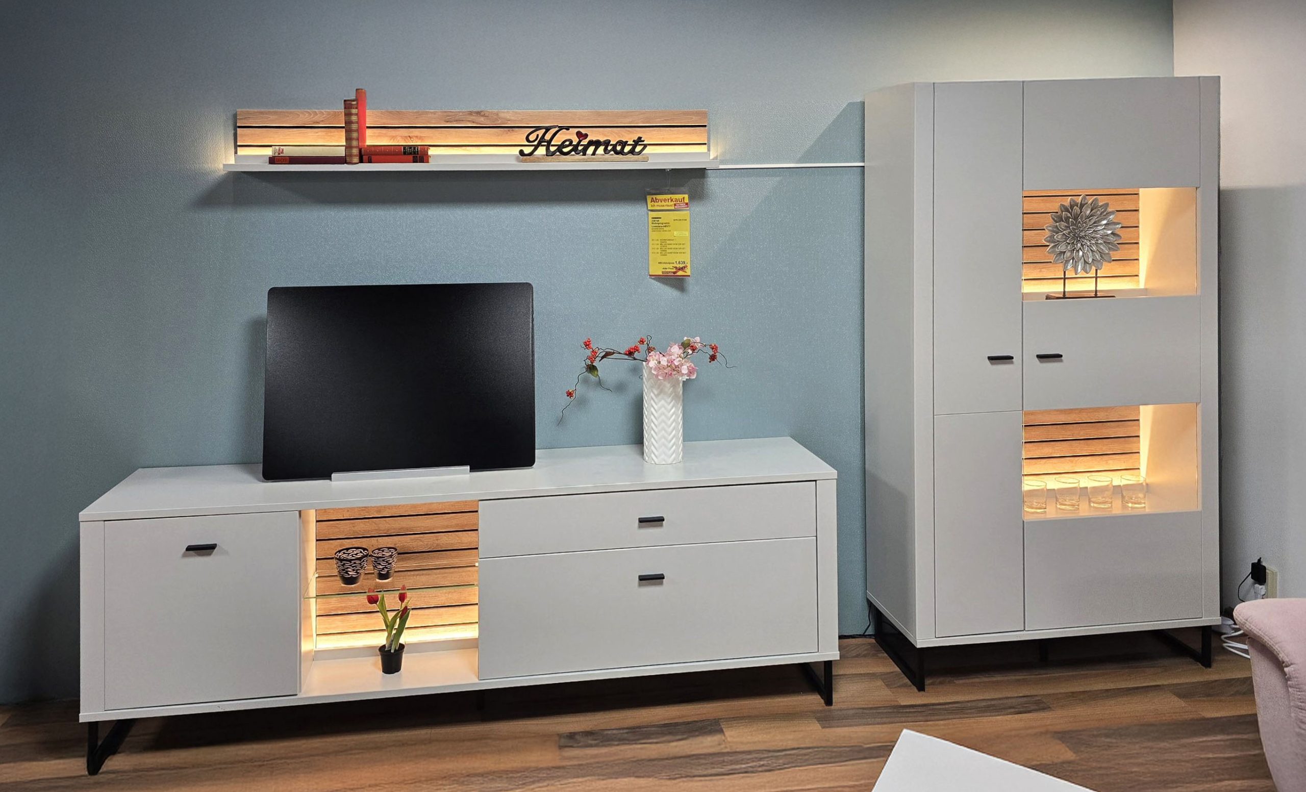 Bestehend aus: Kombi-Vitrine (B100 H 185 T37 cm), TV-Element (B210 H69 T 44 cm) und Wandpaneel (B150 H19 T20 cm).