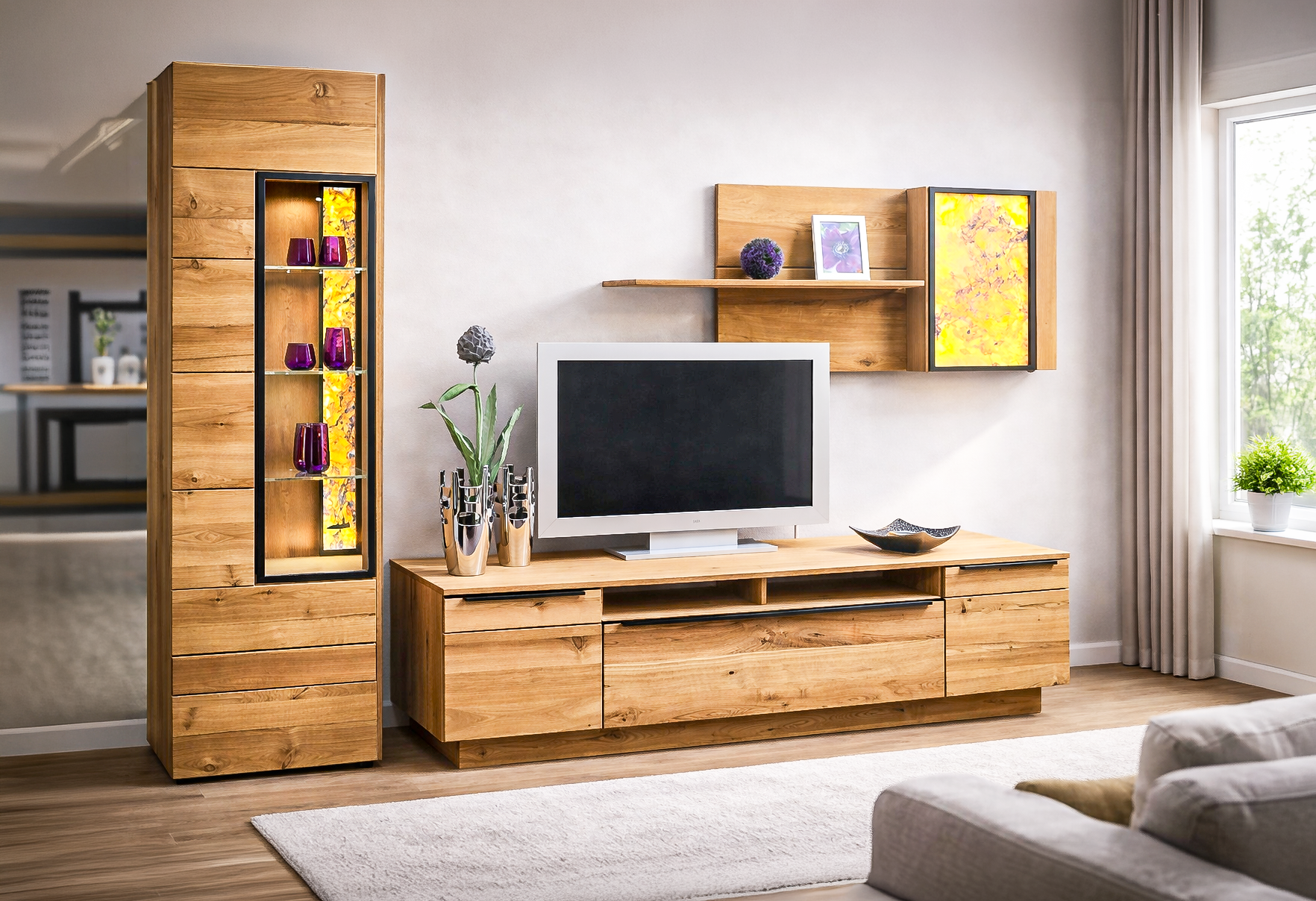 bestehend aus Vitrine, Lowboard und Wandpaneel in Asteiche massiv natur geölt.