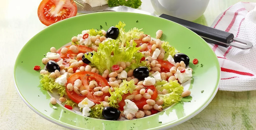 Die Bohnen und Oliven abtropfen lassen, die Tomaten in Scheiben, die Chilischote in feine Ringe schneiden, dabei die Trennwände entfernen. Die Salatblätter putzen, waschen und mundgerecht zerkleinern. Die Salatzutaten vorsichtig mischen und auf Tellern anrichten. Den Schafskäse etwas zerbröckeln und darüber geben. Die Knoblauchzehe schälen und durch die Presse drücken. Salz, Pfeffer und Knoblauch mit […]