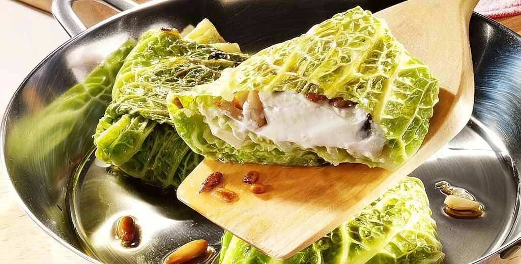 Gefüllte Wirsing-Taschen mit Ziegenkäse, Honig und Pinienkernen