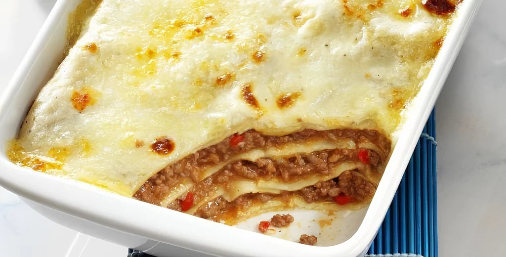 Knoblauchzehe und Zwiebel schälen und fein hacken. In heißem Olivenöl anschwitzen, das Hackfleisch zugeben und so lange braten, bis es grau und krümelig geworden ist. Die Gewürze, 250 ml Brühe und die geschälten Tomaten mit Saft dazugeben. Zum Kochen bringen. Die Nudelblätter in reichlich Salzwasser mit 1 EL Öl „al dente“ kochen, abgießen, kurz kalt […]
