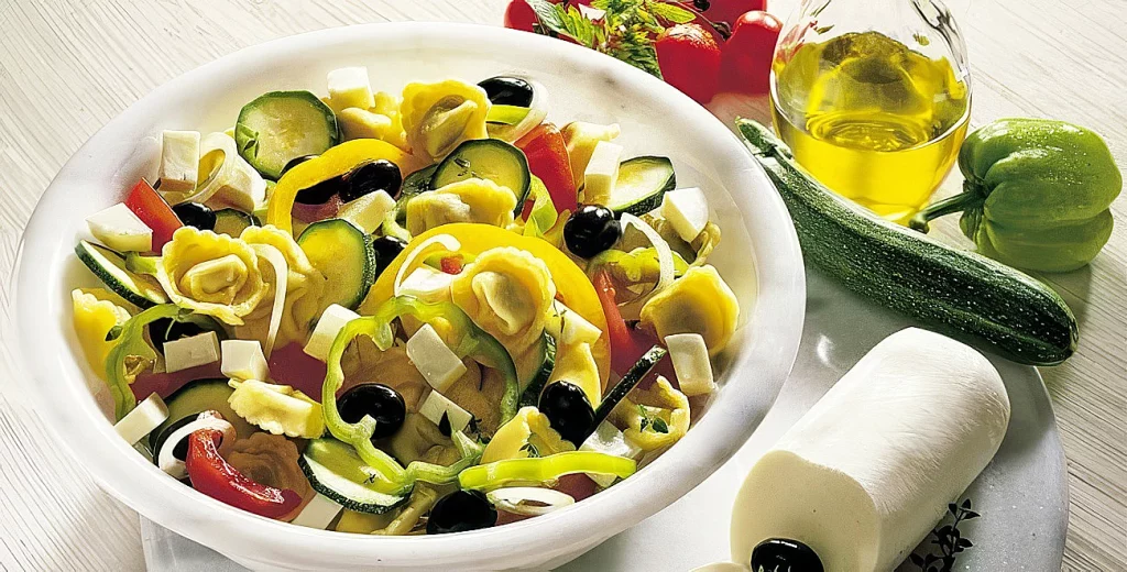 Tortellini nach Packungsvorschrift „al dente“ zubereiten, abgießen, kalt überbrausen und auskühlen lassen. Tomaten halbieren, Kerne und Stielansätze entfernen und in Spalten, die Zucchini in Scheiben schneiden. Paprikaschoten in Ringe schneiden, dabei die Kerne und die Scheidewände entfernen. Zwiebeln schälen und in Ringe schneiden. Mozzarella zuerst in Scheiben schneiden und anschließend würfeln. Oliven abtropfen lassen. Alles […]