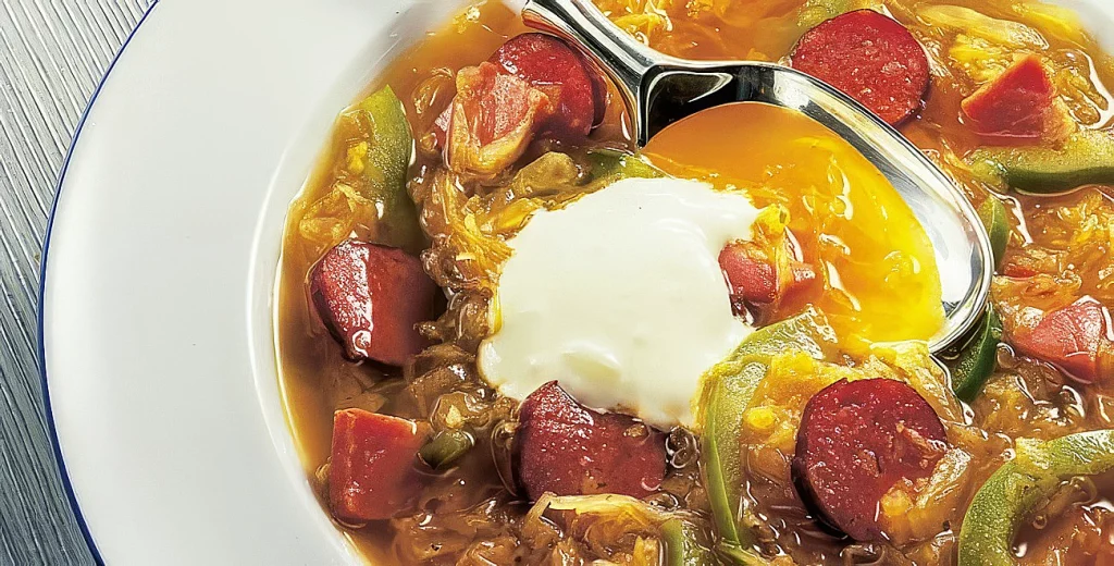 Den Räucherspeck fein würfeln und in heißer Butter in einem großen Topf anbraten. Die Zwiebel und die Knoblauchzehe klein schneiden, dazugeben und dünsten, bis die Zwiebelwürfel glasig sind. Mit der Fleischbrühe auffüllen und das Ganze zum Kochen bringen. Das Sauerkraut sowie das klein gewürfelte Kasseler hinzugeben und die Suppe zugedeckt etwa 30 Minuten köcheln lassen. […]