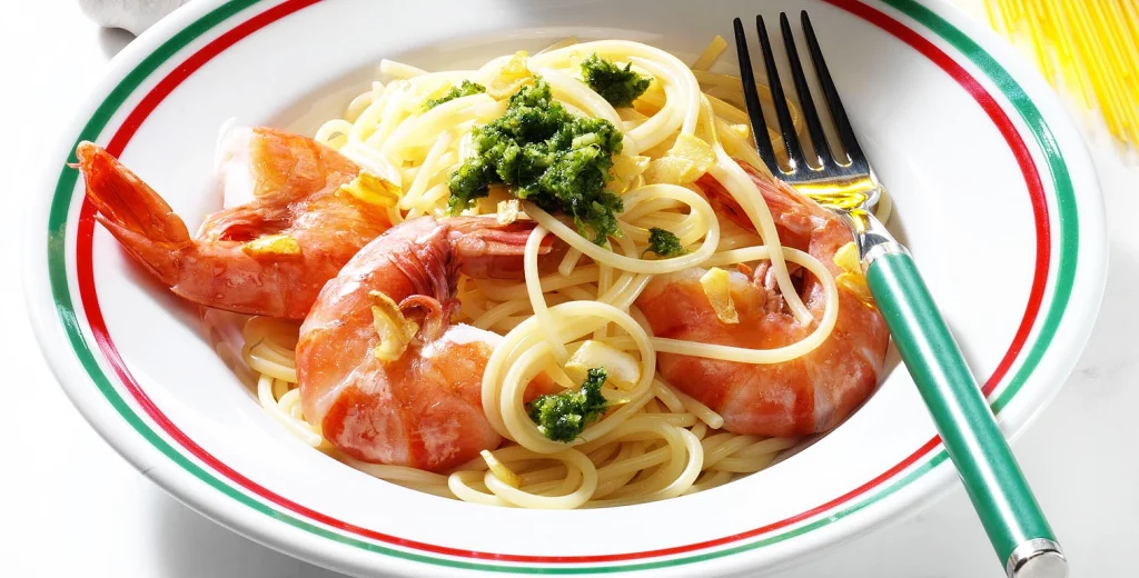 Spaghetti mit Bärlauch-Pesto und Garnelen