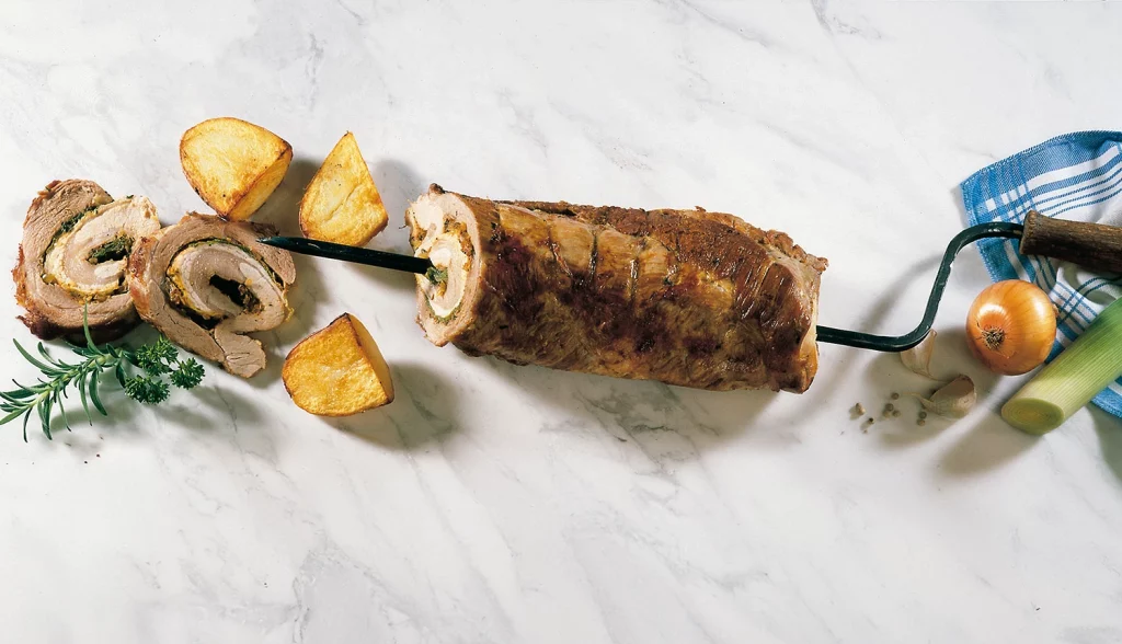 Schweinebauch vom Metzger vorbereiten und einschneiden lassen, dabei Fett großzügig entfernen. Lauch waschen, putzen, kurz blanchieren und längs in Stücke schneiden. Zwiebeln und Knoblauch schälen und fein hacken. Das Rapsöl mit den Zwiebel- und Knoblauchstücken, mit der fein gewiegten Petersilie und dem Senf zu einer Marinade verrühren und diese kräftig mit Salz, Pfeffer und Paprikapulver […]